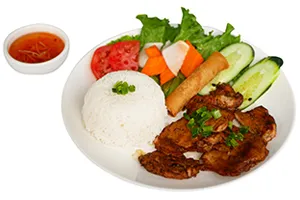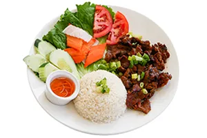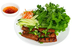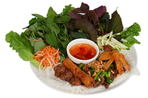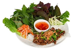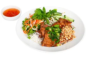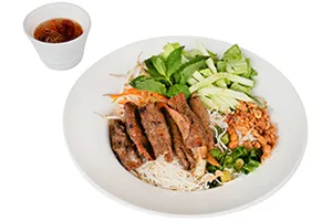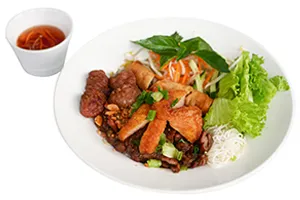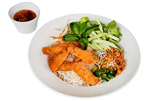 Thin vermicelli plates feature thin vermicelli and come with rice paper wraps so you can create your own spring rolls. Each plate comes with a side of romaine lettuce, julienne cucumber, pickled carrots and daikon, mint leaves, and basil. Served with a sweet fish sauce.