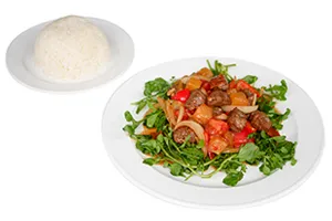 Tender beef steak is marinated in a pepper soy sauce, and then stir fried with onions, peppers, tomatoes.