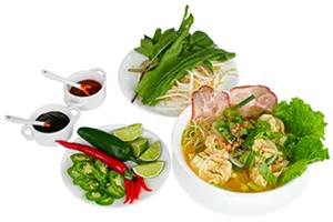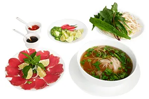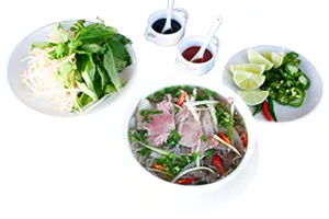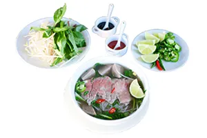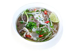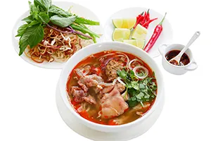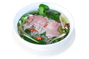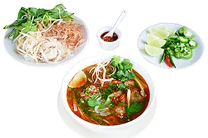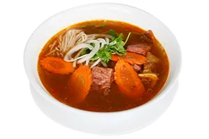 Famous soup from the Hue region of Vietnam. Sliced shank, shrimp meatball, tendon and pork knuckle in a beef broth with minced lemongrass and served with thick vermicelli noodles. (Regular: $16.95, Ex-Large: $18.95)