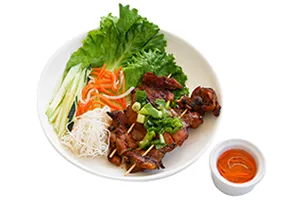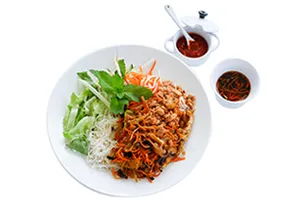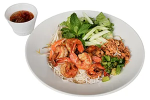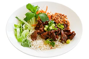 Vermicelli bowls feature rice vermicelli noodles and come with a side of lettuce, julienned cucumbers, pickled carrots and daikon, bean sprouts, mint, and are garnished with crushed peanuts and pan-fried scallions. These dishes are served with a sweet fish sauce.