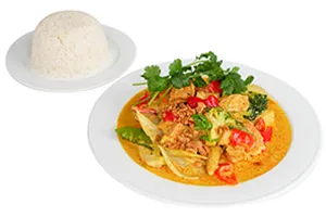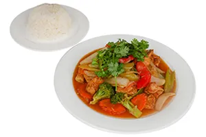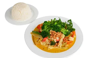 Our coconut curry sauce is stir fried with snow peas, broccoli, peppers, onions, and your choice of beef, chicken, shrimp, or seafood. (For seafood add $2)