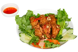 Hot crispy egg roll consists of ground pork, shrimp, taro, shitake mushrooms, and thin vermicelli. Served with sweet fish sauce.