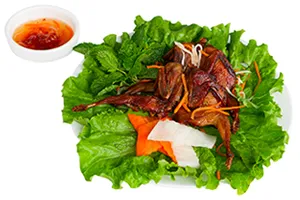Quail marinated in our special lemongrass soy sauce is served on a bed of lettuce.