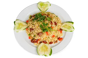 Tofu is stir fried in a spicy lemongrass sauce with snow peas, broccoli, and peppers. Comes with a side of rice.