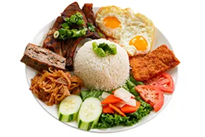Rice plates come with a side of vegetables and are served with sweet fish sauce.