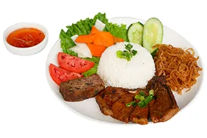 Grilled pork chop, shrimp tofu, julienned pork skin, fried egg, and Vietnamese meatloaf.