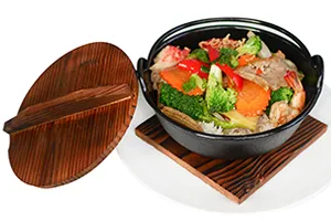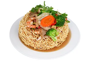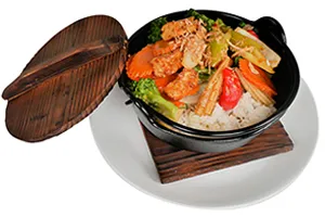 Shrimp, squid, fish cakes, beef and chicken are stir fried with snow peas, broccoli, baby corn, and carrots, and then set on a sizzling bed of rice in a hot clay pot.