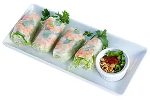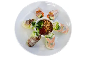Spring rolls are served cool to the touch and are light and refreshing. Shrimp, mint, lettuce and vermicelli wrapped in soft rice paper. Served with peanut sauce.