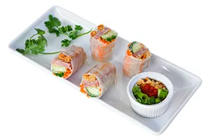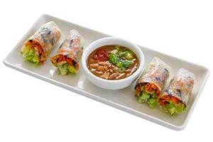 Tofu, Shitake mushroom, carrots, lettuce, and vermicelli wrapped in soft rice paper. Served with peanut sauce.