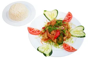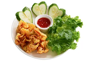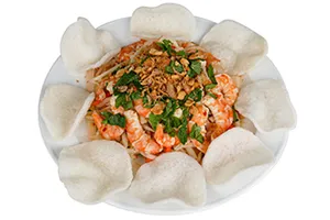 Shrimp salad with julienned lotus root, carrots, cucumber, and cabbage. Tossed in a refreshingly tangy dressing and topped with chopped basil, pan-fried onions, crushed peanuts and comes with shrimp chips.