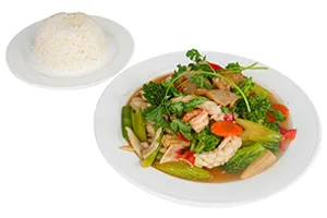 Shrimp, squid, and fish cakes are stir fried with snow peas, broccoli, baby corn, and carrots, then set on a sizzling bed of rice, in a hot clay pot.