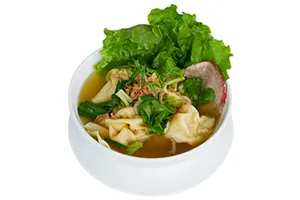 Shrimp and pork wonton dumplings in a light chicken broth, served with egg noodles.