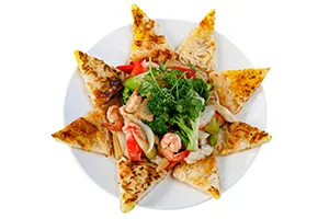 Squid or shrimp are fried in a light batter with diced peppers and onions and are served on a bed of lettuce. (The shrimp is prepared with head and shell on, but can be prepared unshelled upon request).