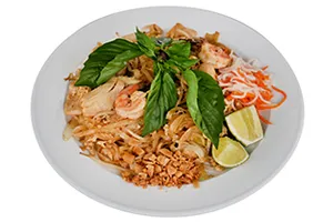 Stir fried rice noodles with shrimp, chicken, egg, bean sprouts, and onion. Garnished with basil leaves, lime, and crushed peanuts.