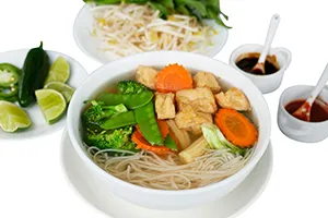 Tofu, snow peas, broccoli and carrots in a vegetable broth served with pho noodles.